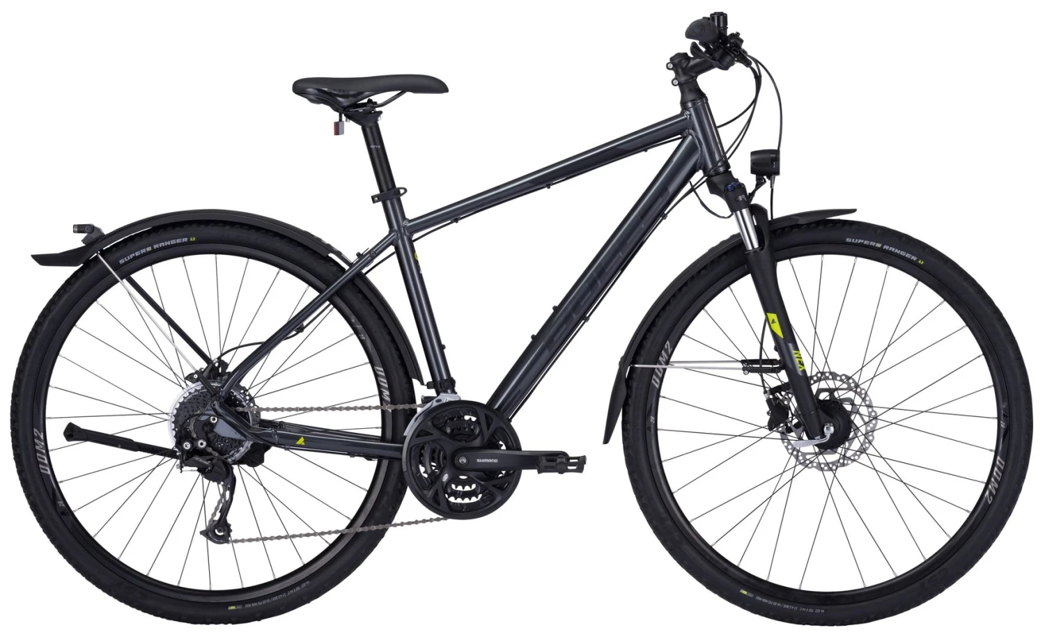 6061-Alu-Biaxial-Rahmen, Suntour NEX-DS-HLO Federgabel, 27-Gang Shimano Alivio Schaltwerk, Altus Umwerfer, Schalthebel und Kurbeln, Shimano MT201 Disc-Bremsen (160/180mm), DDM-2 Disc Felgen, Supero Ranger Reifen 44-622, Nabendynamo, 50 Lux LED-Sensorlampe, Standlicht, SKS Velo Steckbleche mit Streben, Pletscher Flex-40 Ständer