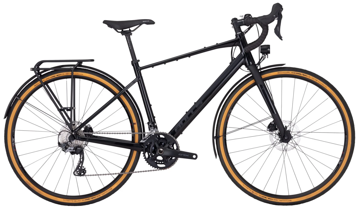 6061 Alu d.b. Rahmen mit tapered Steuerrohr, Carbon Aero-Gabel, Shimano GRX-810 22-Gang Compact Schaltwerk und Umwerfer, GRX-600 Brems-Schalthebel, GRX400 hydr. Scheibenbremsen, GRX-600 Kurbeln 30-46 mit Hollowtech-II Innenlager, 11-32 Zahnkranz, Schwalbe G-One Allround Reifen (40-622), XC-21 Disc Felgen, KT Nabendynamo, Fuxon FS-70 Lampe, RL-Mini Rücklicht, Oversized Lenker, Cork Lenkerband