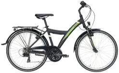 7005-Alu-Biaxial-Rahmen, Suntour NVX Federgabel, 21-Gang Shimano Tourney Schaltwerk und Umwerfer, EZ-Fire Schalthebel, Suntour Kurbeln, Tektro V-Bremsen, Formula HR-Nabe, Alu-Felgen, Nabendynamo, LED-Lampe, Standrücklicht, Ständer, Steckbleche