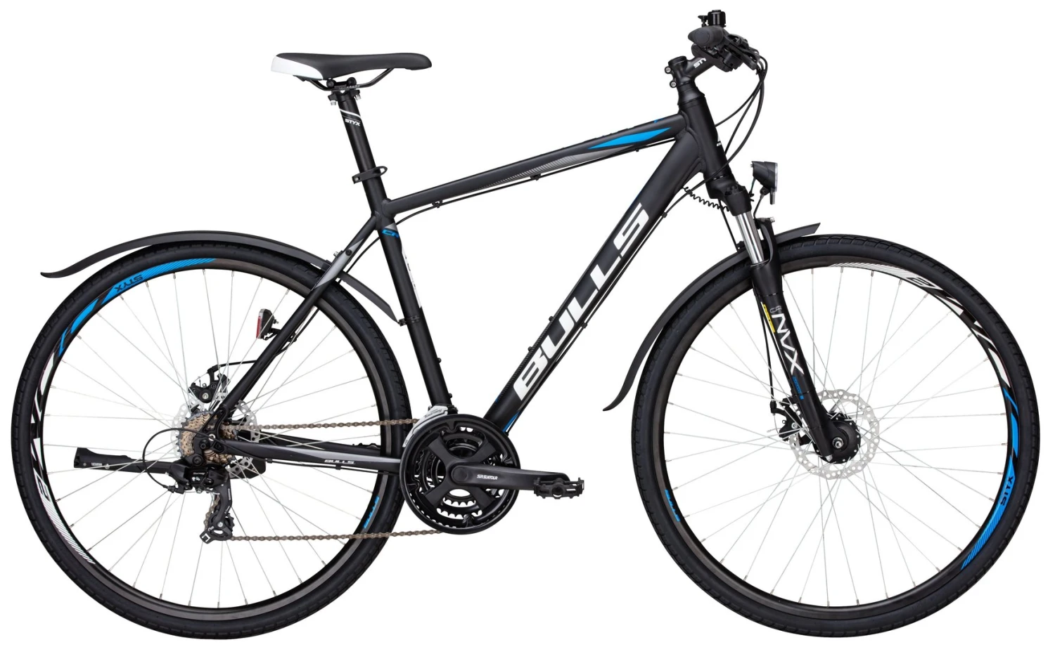 7005-Alu-Biaxial-Rahmen, Suntour NVX Federgabel, 21-Gang Shimano Tourney Schaltwerk und Umwerfer, EZ-Fire Schalthebel, Suntour Kurbeln, Tektro Novela Disc-Bremsen, Formula HR-Nabe, Alu-Hohlkammerfelgen, Nabendynamo, LED-Lampe, Standrücklicht, Ständer, Ste