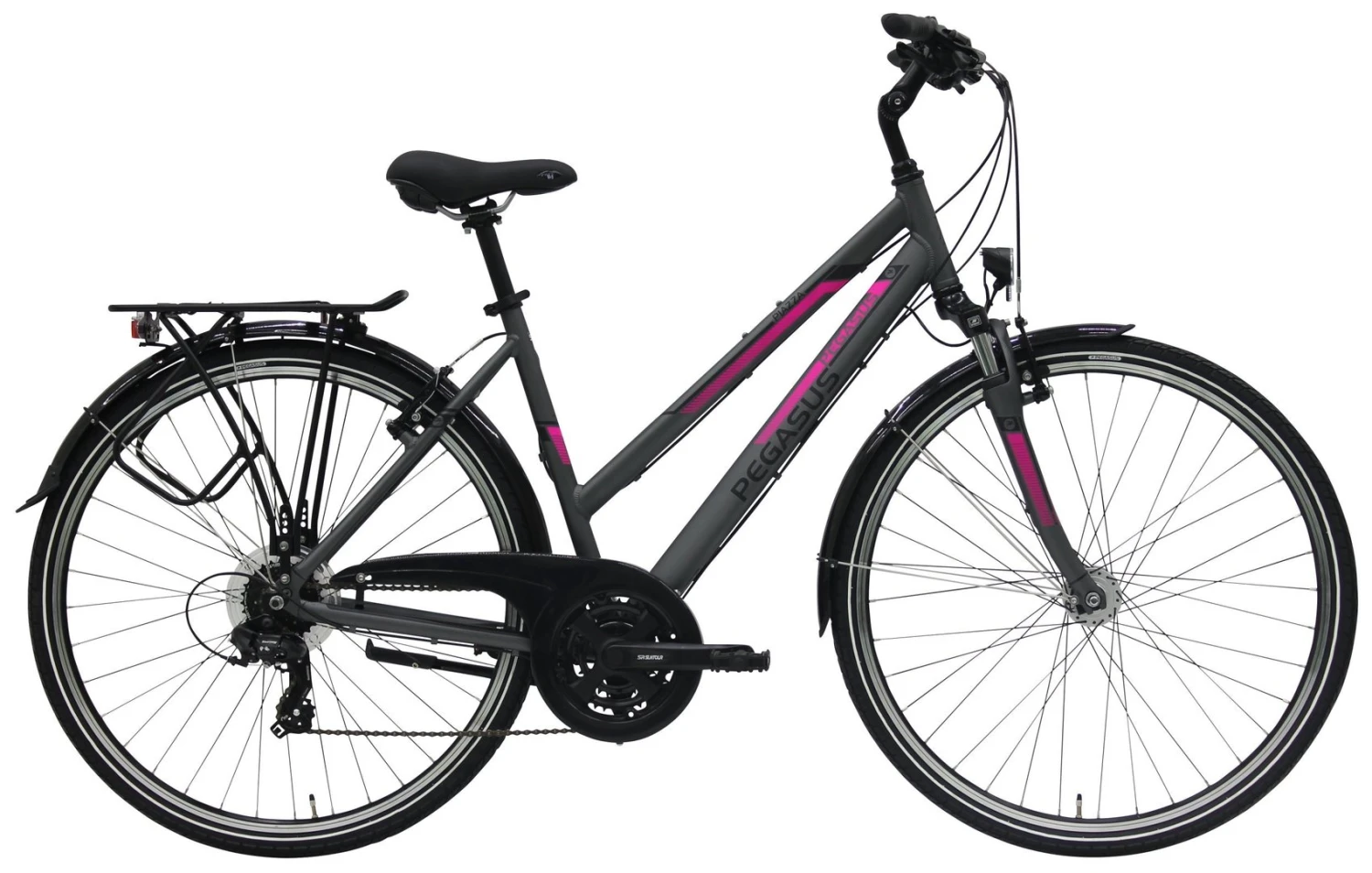 Alu Rahmen, Suntour CR-7V Federgabel, Shimano Tourney 21-Gang Schaltwerk und Umwerfer, Altus EZ-Fire, Suntour Kurbeln mit gekapseltem Lager, Alu V-Bremsen, DBM-1 Hohlkammer-Felgen, verstellbarer Vorbau, Nabendynamo, 15 Lux LED-Lampe, Standrücklicht